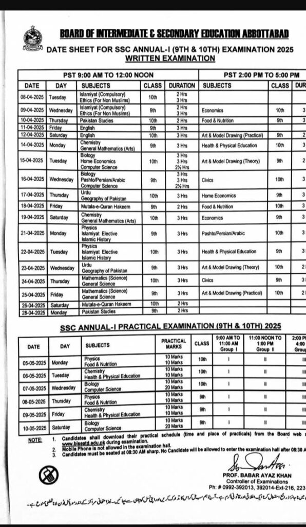 ایبٹ آباد بورڈ نے میٹرک (نہم و دہم) کے سالانہ امتحانات 2025 کے لیے ڈیٹ شیٹ جاری کر دی ہے۔ ان امتحانات کا آغاز 8 اپریل 2025 سے ہوگا اور تحریری امتحانات 28 اپریل 2025 تک جاری رہیں گے۔ اس کے بعد عملی امتحانات (Practical Exams) کا آغاز 5 مئی 2025 سے کیا جائے گا۔